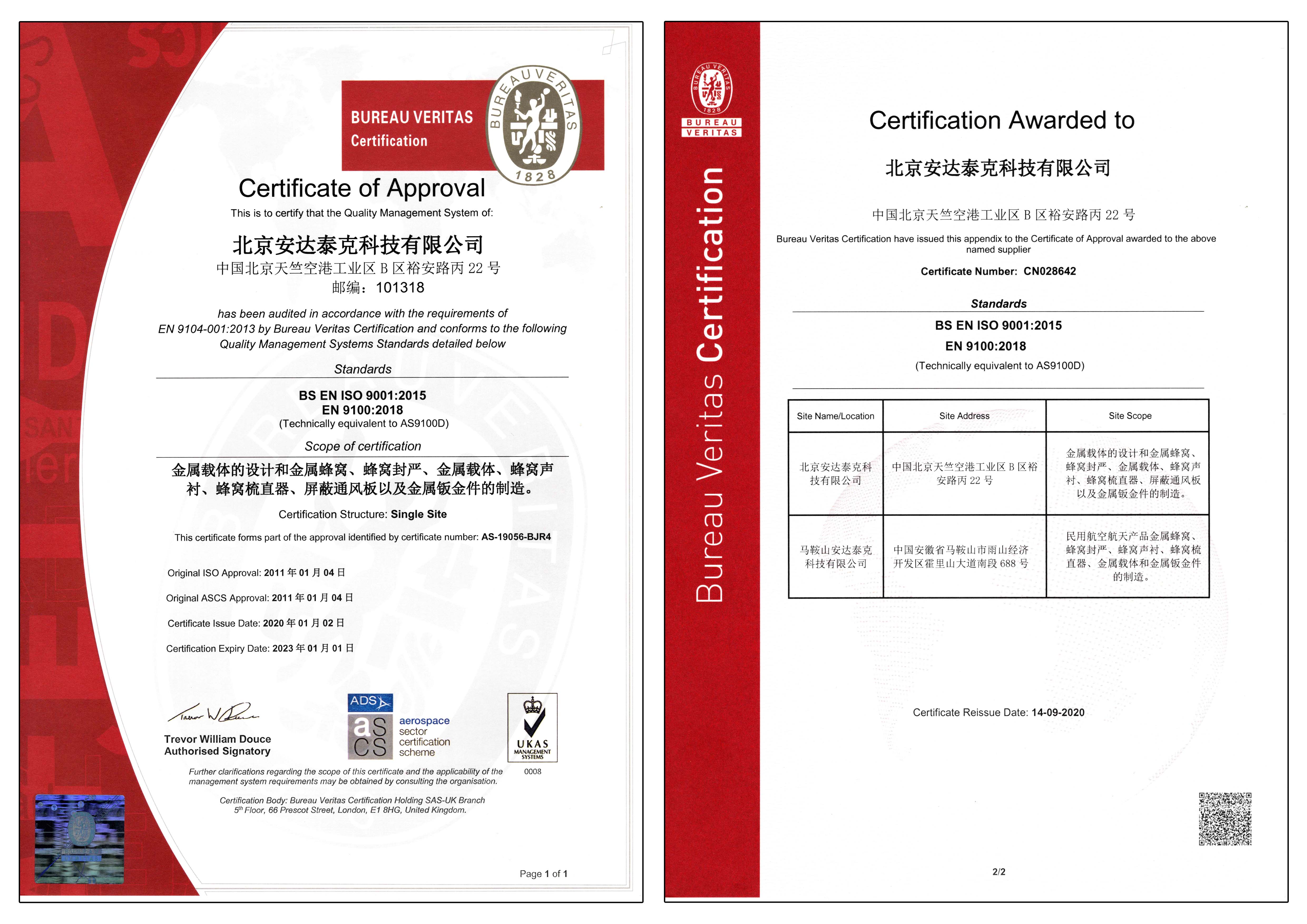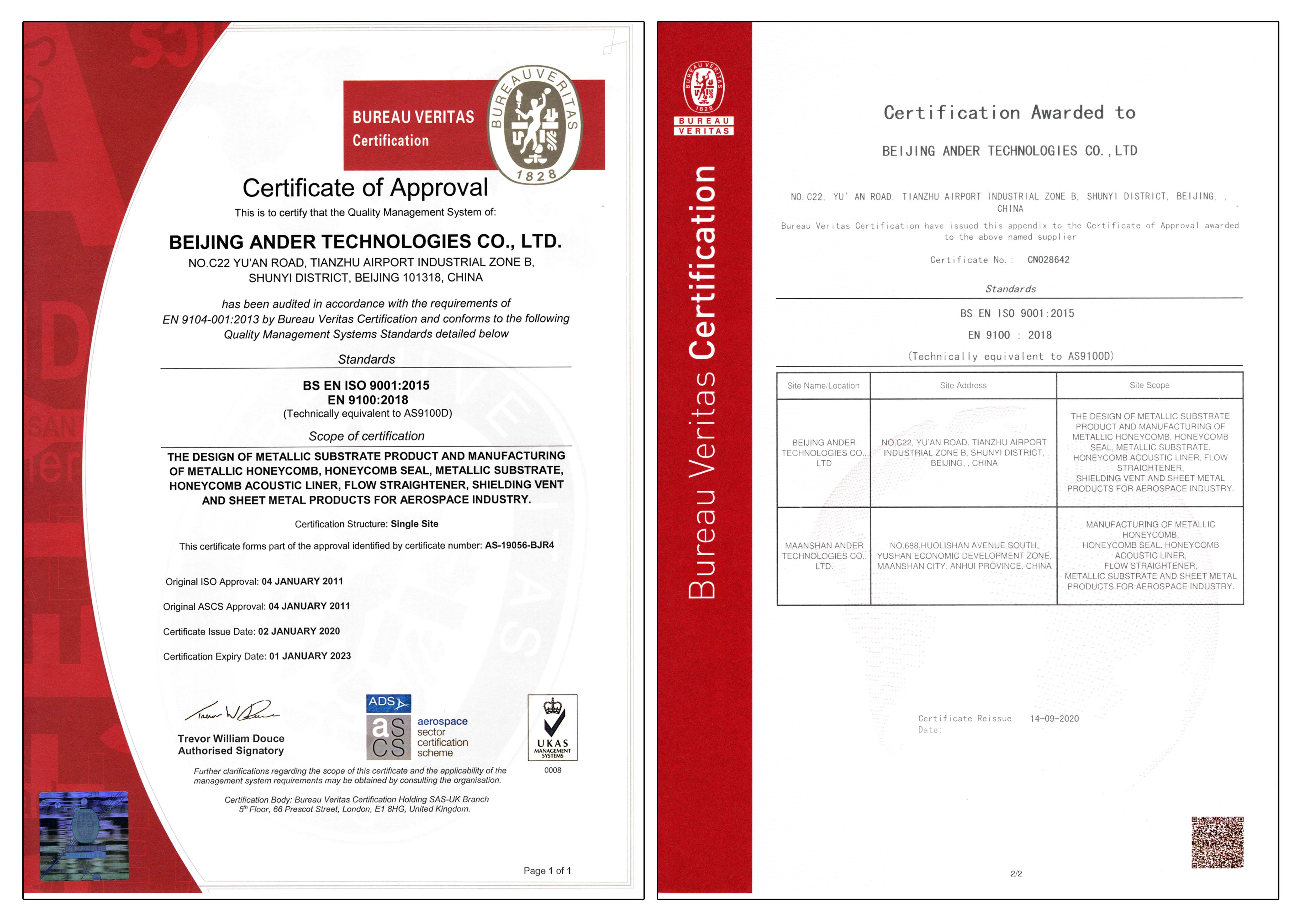 Beijing Ander Technologies, a full-service manufacturer of metal honeycomb parts, announced today that it has achieved certification to the AS9100 Rev. D (AS9100D) quality management system standard at the branch facility, Ma’anshan Technologies (MAT) Co., Ltd. located in Ma’anshan, Yushan Aera.