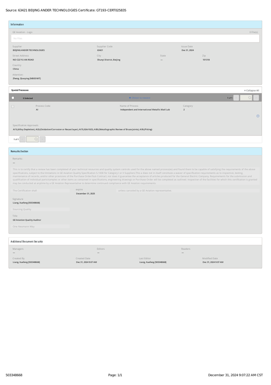 北京安達(dá)泰克科技有限公司實(shí)驗(yàn)室獲Nadcap和GEA S-400實(shí)驗(yàn)室認(rèn)證證書(shū)