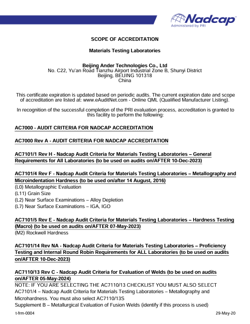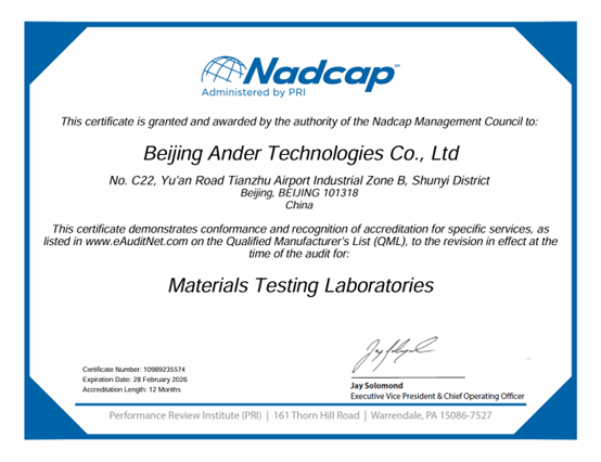 時(shí)間:2025-02-07 來(lái)源:Ander新春佳節(jié)剛過(guò),北京安達(dá)泰克科技有限公司實(shí)驗(yàn)室就收到了PRI頒發(fā)的Nadcap MTL實(shí)驗(yàn)室認(rèn)證證書(shū)。至此,北京安達(dá)泰克科技有限公司實(shí)驗(yàn)室相繼通過(guò)GEA S-400和Nadcap實(shí)驗(yàn)室認(rèn)證,標(biāo)志著安達(dá)泰克實(shí)驗(yàn)室的技術(shù)和管理水平邁上了新臺(tái)階。